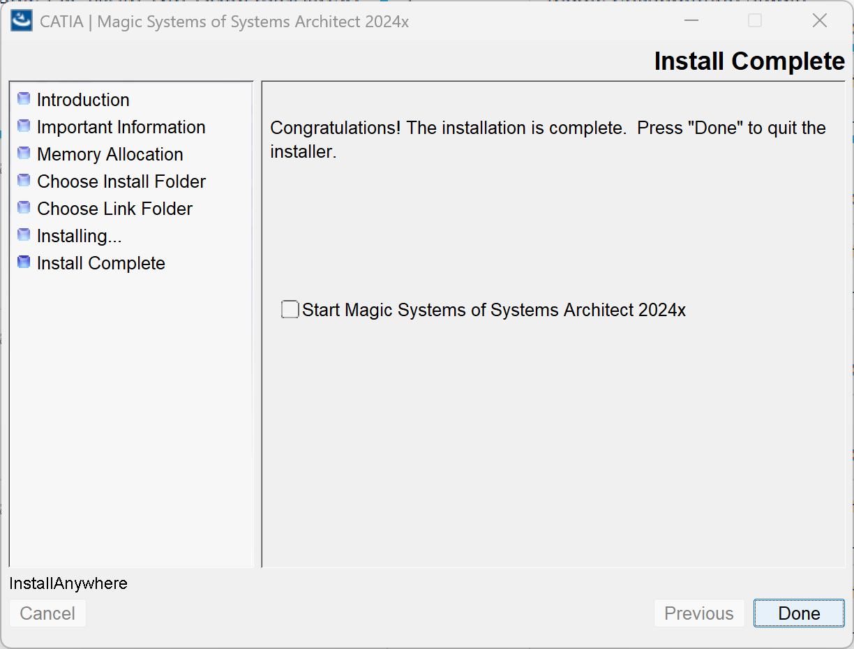 Students enrolled in an MBSE course should follow the steps in this installation guide to download and install Magic Systems of Systems Architect 2024x on their own computers. By walking through each screen and selecting the default or custom options as needed, you’ll have the software correctly installed and ready for use in class activities and assignments. Completing the setup on your personal equipment ensures you’re familiar with the tool and can participate fully in exercises anytime.